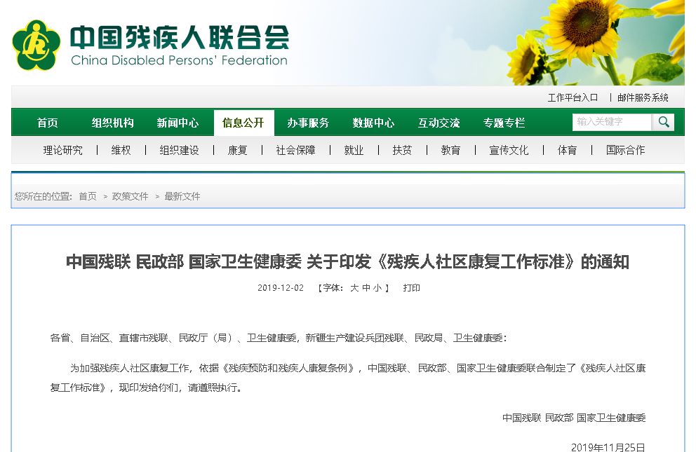 为加强残疾人社区恢复作业,近来,我国残联、民政部、国家卫生健康委联合拟定了《残疾人社区恢复作业规范》(以下简称《规范》),对各地规范展开残疾人社区恢复作业提出了要求。