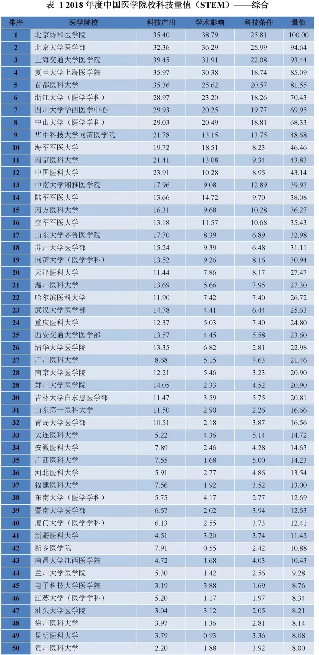 2018年度我国医学院校科技量值(STEM)排名概况见下表 (戳图可放大观看):