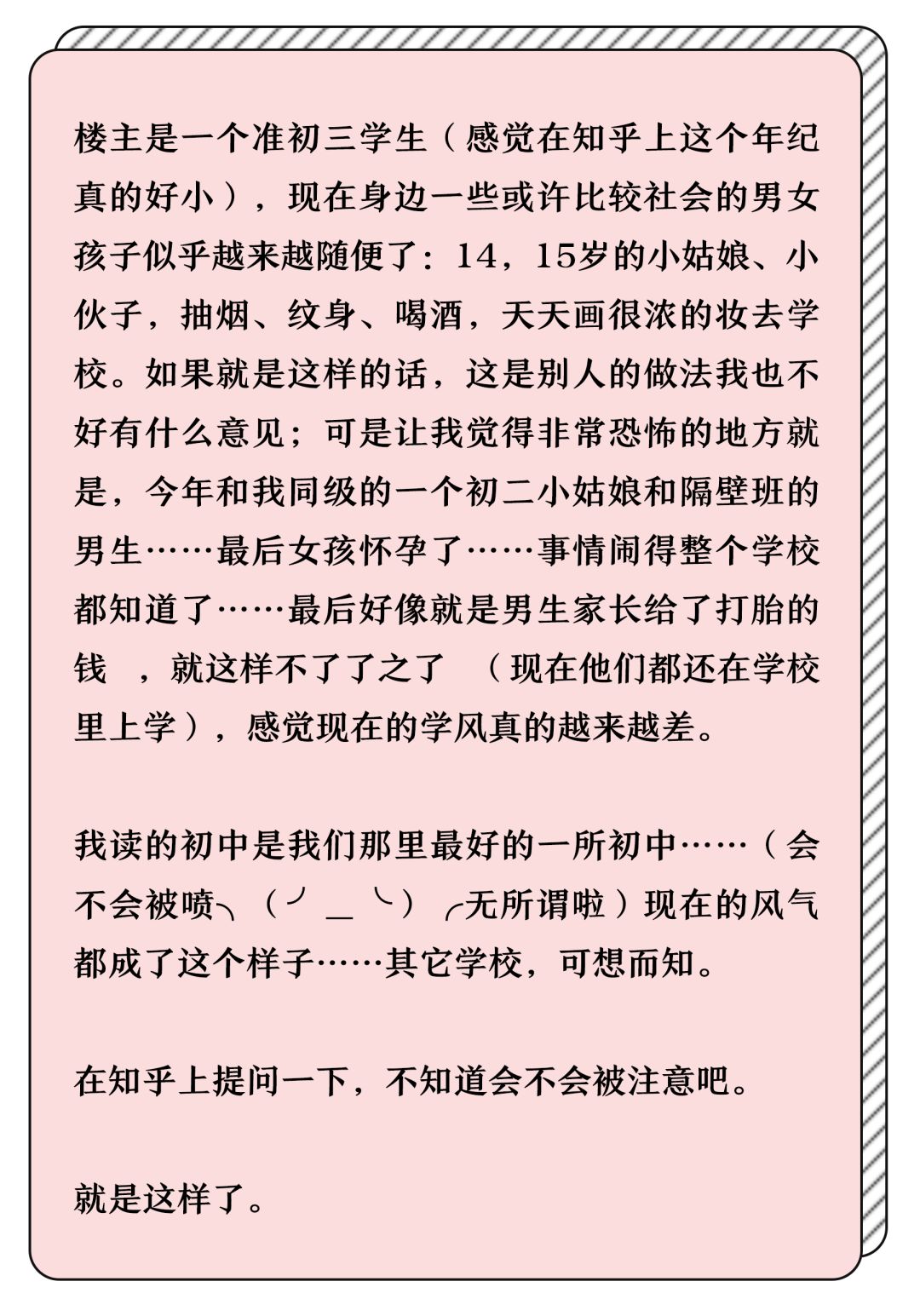 有人在知乎上提出了「为什么现在有一些初高中的孩子越来越不珍惜自己的身体?」这样的一个问题, 并且约请老六来答复,作为一名妇产科男医师,我就来说医院里发作的故事吧。