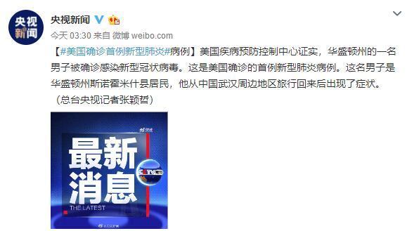 人民网北京1月22日电 据中央电视台新闻中心官方微博音讯, 美国疾病防备控制中心证明,华盛顿州的一名男人被确诊感染新式冠状病毒。这是美国确诊的首例新式肺炎病例。这名男人是华盛顿州斯诺霍米什县居民,他从我国武汉周边地区游览回来后呈现了症状。