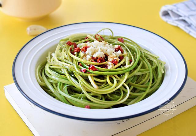 6、大蒜用压泥器压成蒜泥,掩盖在蒜薹上。