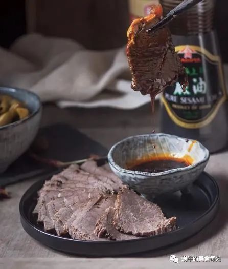 9、 捞出沥干放凉后,依据牛肉的纹路横切成薄片