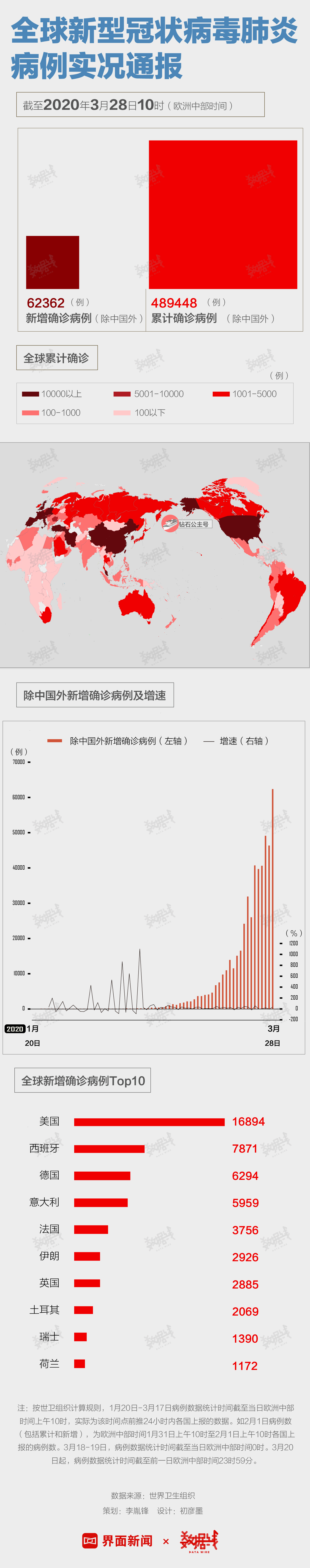 WHO多个方面数据显现,到欧洲中部时刻3月28日10时(北京时刻3月28日17时),全球确诊新冠肺炎病例571678例,逝世26495例,我国以外新冠肺炎确诊病例489448例。除我国外全球新增确诊病例62362例,较昨日同比大幅上升34.5%。