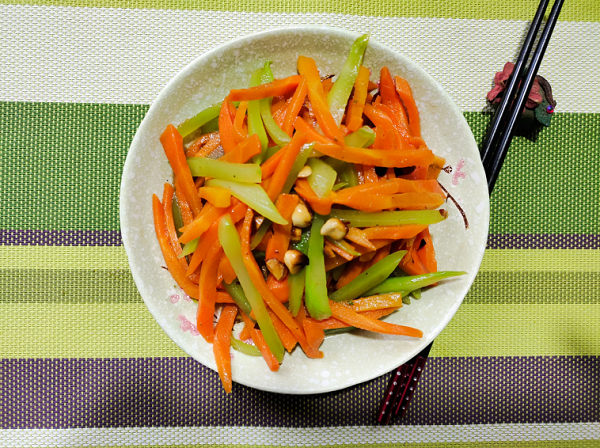 胡萝卜中含有很多的胡萝卜素,这种物质进入人体之后,通过肠道中酶的分化,能够转化成维生素A,不光能够护肝养胃,关于缓解视疲惫和进步睡觉质量,都很有协助。这次小飞要制造的便是翡翠双丝,也便是常说的胡萝卜拌莴笋,需求用到的食材,除了莴笋和胡萝卜各200克之外,还要有30克的花生豆,再便是生抽、米醋、食盐、白糖、辣椒面、芝麻油和食用油各1勺。